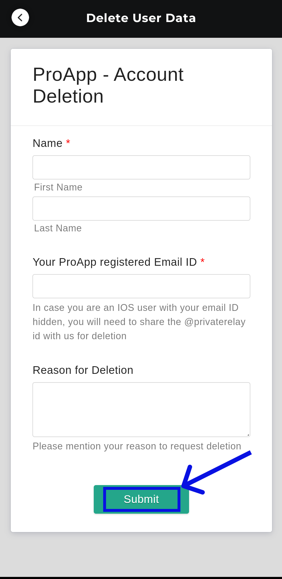 5. After clicking on the "Delete Data" button, fill out the form and click "Submit". After receiving your response, our team will deactivate your account within 24-48 hours.