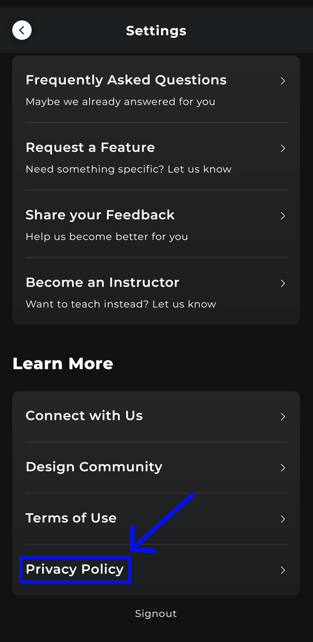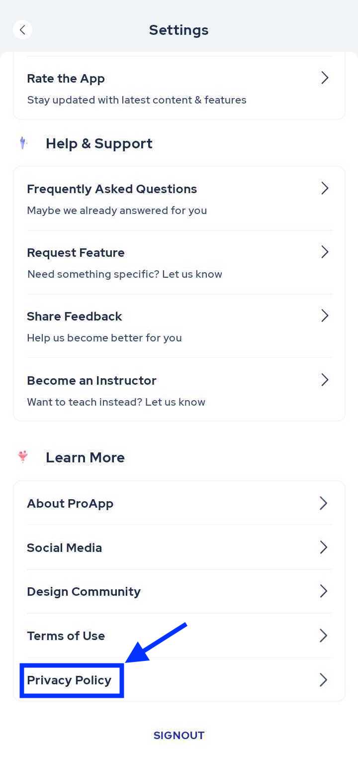 3. In the settings page, scroll towards the Privacy Policy page